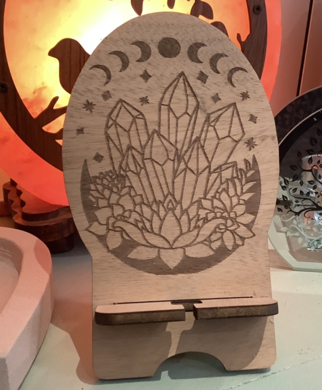 Support pour téléphone portable en bois gravé cycle lunaire cristaux